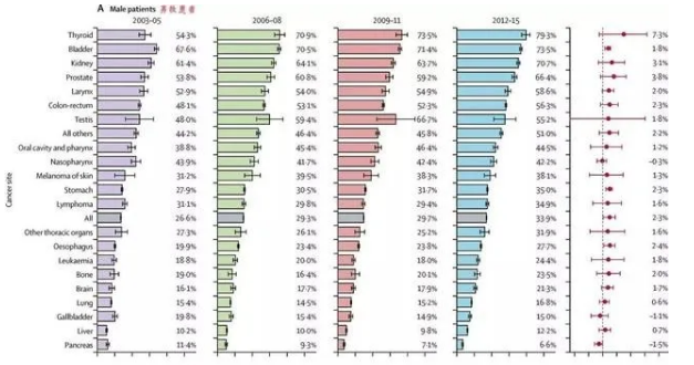 近日,《柳叶刀》公布了一项研究调查,研究人员分析了国内17个癌症登记处12年来的癌症患者生存率,覆盖2300万人,发现各个癌种的5年生存率都有不同的增长。就连排在治疗难度前列的肝癌和肺癌,也都有2%的涨幅。其中,数据最可观的是甲状腺癌,5年生存率达到了80%左右,让人看到了希望。