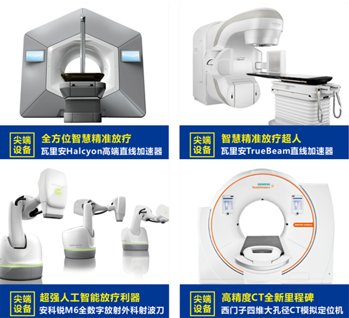 国际肿瘤医疗中心长期致力于向中国医疗领域引进国际上最前沿的治疗技术,全球领先的肿瘤医学影像诊断与放射治疗设备:美国瓦里安TrueBeam与Halcyon医用直线加速器、首台带有多叶光栅与动态跟踪模式的美国安科瑞M6放射外科射波刀、西门子双光子四维大孔径CT模拟定位机、PET-CT先后入驻我院,这些大型先进的肿瘤治疗设备组合在一起,形成了一套先进、完整、智能化的“智慧精准放疗”技术体系,打造了华南领先的肿瘤放疗中心,可高精准、高疗效、低损伤治疗各类早中晚期肿瘤,为华南地区广大患者提供与国际同步的高质量医疗服务。