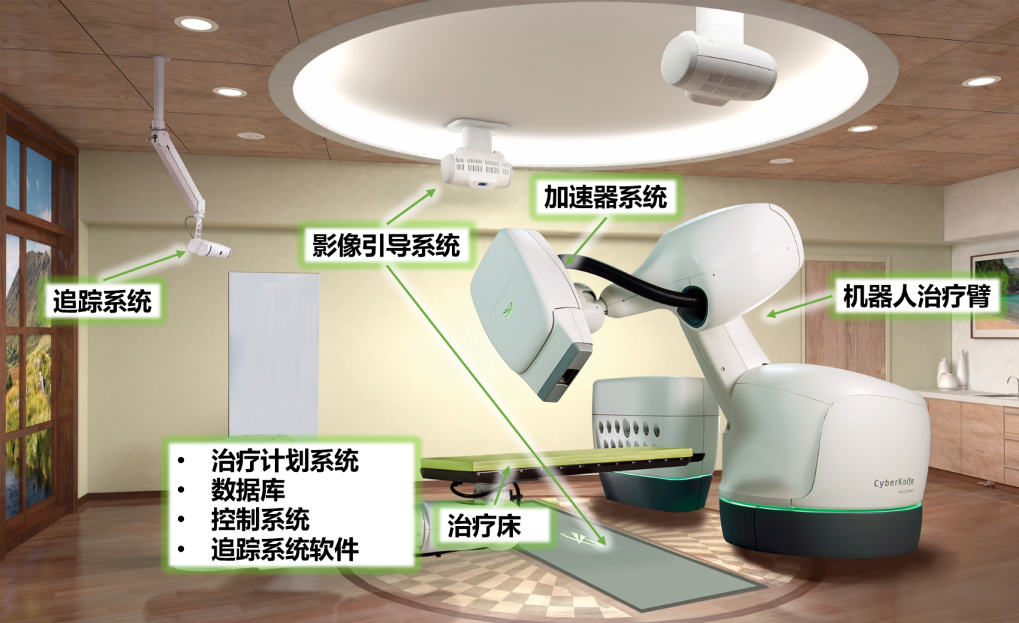 射波刀主要由加速器系统 、机器人治疗臂、治疗床、影像引导系统、追踪系统和治疗计划系统构成。